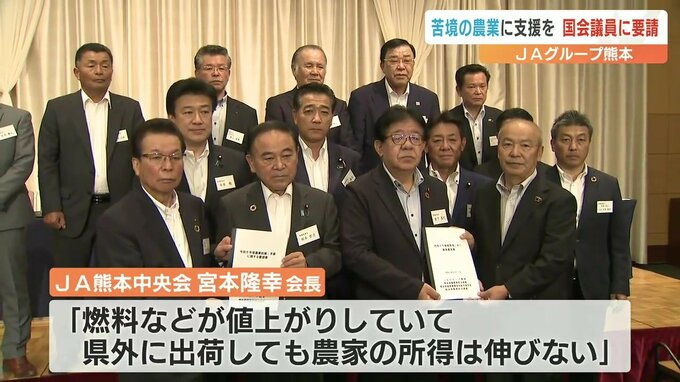 燃料や肥料などの高騰で農業は苦しい状況が続いているとしてJAグループ熊本が、熊本選出の国会議員に対策の強化を求めました。JAグループ熊本の代表者が熊本選出の国会議員に要請書を手渡しました。JA熊本中央会の…