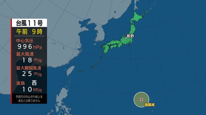 午前9時現在の中心の気圧は996ヘクトパスカル、中心付近の最大風速は18メートルで、中心から半径220キロ以内では、風速15メートル以上の強い風が吹いていて、時速10キロの速さで西へ進んでいます。
