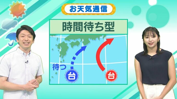 ④時間待ち型:これは一方の台風が進んでいくのを待って、先に進んでもらってから、もう一つの台風が遅れて移動していく。「先輩お先にどうぞ」という感じかもしれません。
