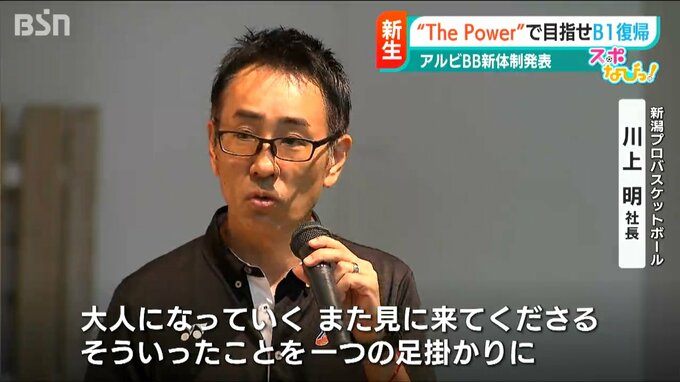 新しいユニフォームに身を包んだ12人の選手たちと共に登壇した新潟プロバスケットボールの川上明社長は「B1昇格を目指して戦うシーズンだということを改めて強く思っております」と力強く語りました。