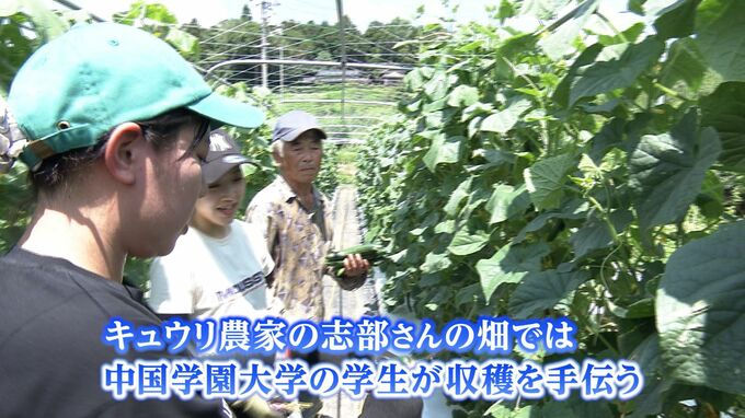 県内最大規模のキュウリの生産量を誇る久米南町。試食会に参加していたキュウリ農家の志部さんの畑では研究の一環として学生らが収穫を手伝ってきました。