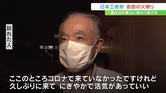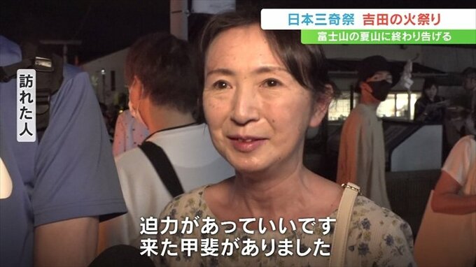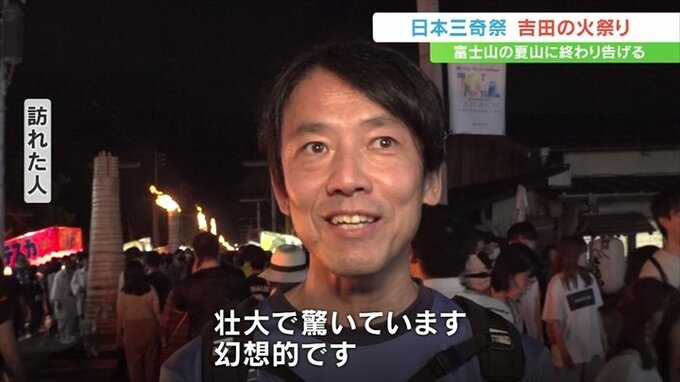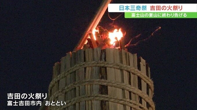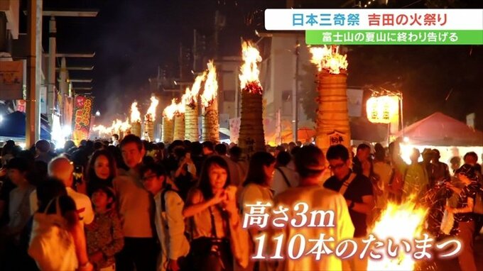富士山の夏山シーズンの終わりを告げる「吉田の火祭り」が26日に山梨県富士吉田市で行われ、110本の松明の炎で街は幻想的な雰囲気に包まれました。