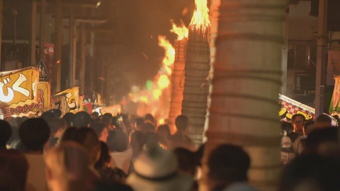 夜空と松明の火で街は幻想的な雰囲気に包まれ、沿道に訪れた多くの人が写真や動画に収めていました。