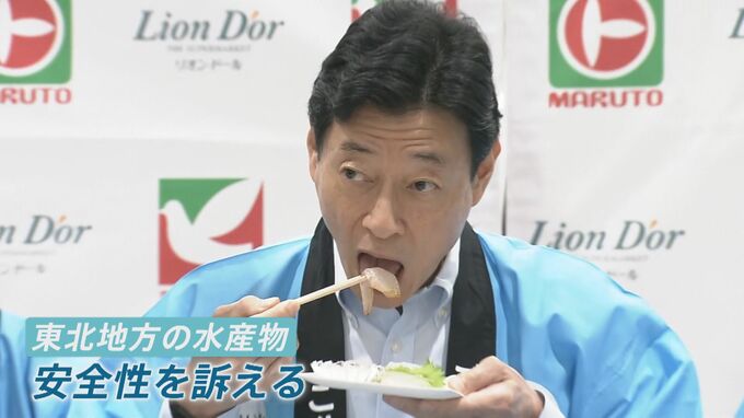 28日、福島県のスーパーを訪れたのは西村康稔 経産大臣。東北地方の水産物の安全性を訴えました。