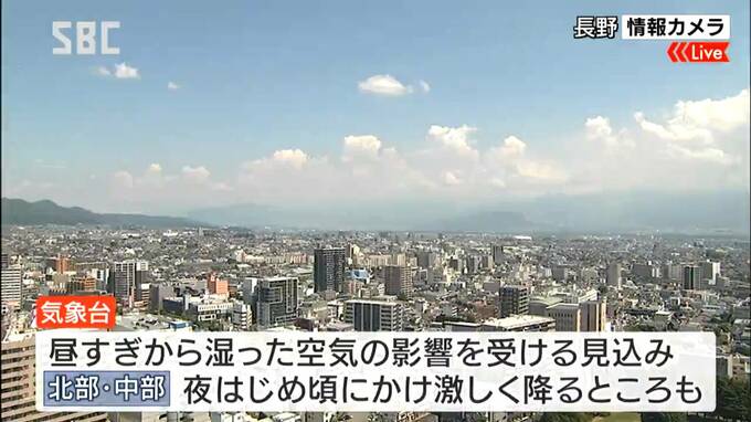 気象台によりますと、県内は昼過ぎから湿った空気の影響を受ける見込みで、雨や雷雨となるところがあり、北部と中部では、夕方から夜のはじめ頃にかけて激しく降るところもありそうです。