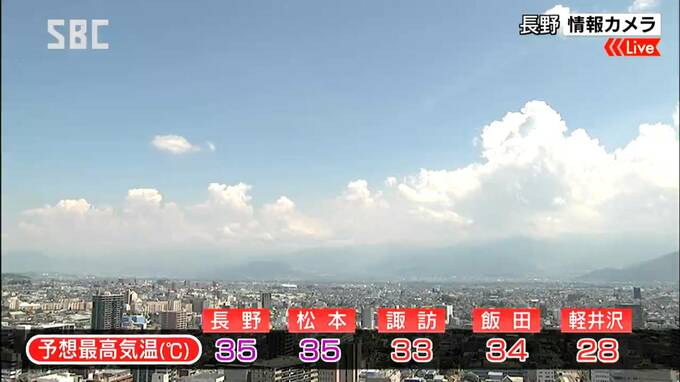 長野と松本では最高気温35度の猛暑日が予想されていて、飯田は34度、諏訪は33度の真夏日になりそうです。