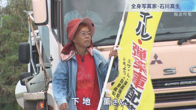 下地薫さんはほぼ毎日、駐屯地のゲート前で工事用トラックの前に、飄々とした表情で立ちはだかり、「反対」の意思表示を続けている。