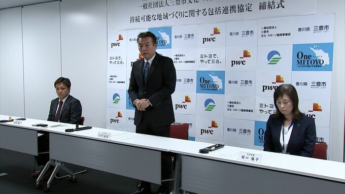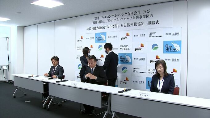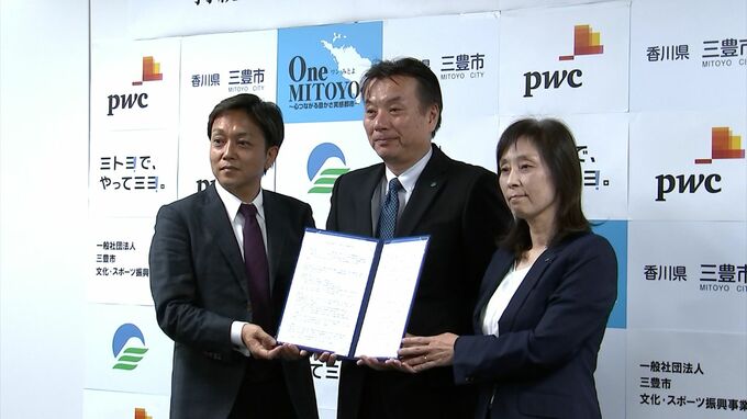 連携協定を結んだのは三豊市と文化・スポーツ振興事業団、PwCコンサルティングです。この協定は中学・高校などで進められている部活動の地域移行について、大きな課題となっている財源の確保方法を探ろうと、結ばれたものです。