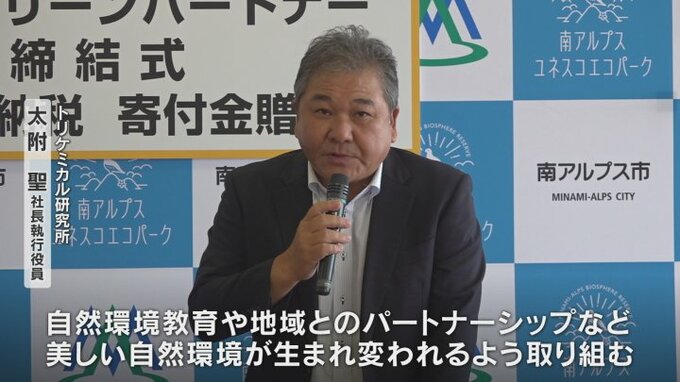 山梨県の南アルプス市と上野原市の化学工業会社が南アルプスの環境保全で協力する協定を結びました。