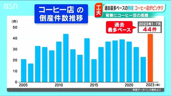 民間の信用調査会社・帝国データバンクによりますと、2023年1月から7月までに全国のコーヒー店44店舗が倒産しています。今のところ新潟県内で倒産したコーヒー店はありませんが、この数は過去最多ペースです。