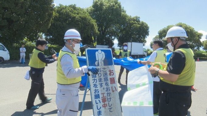 訓練は災害廃棄物の仮置き場の候補地になっている山梨市民総合体育館の駐車場で行われ、参加者はカラーコーンでスペースを確保してブルーシートを敷き廃棄物の種類ごとの看板を設置しました。