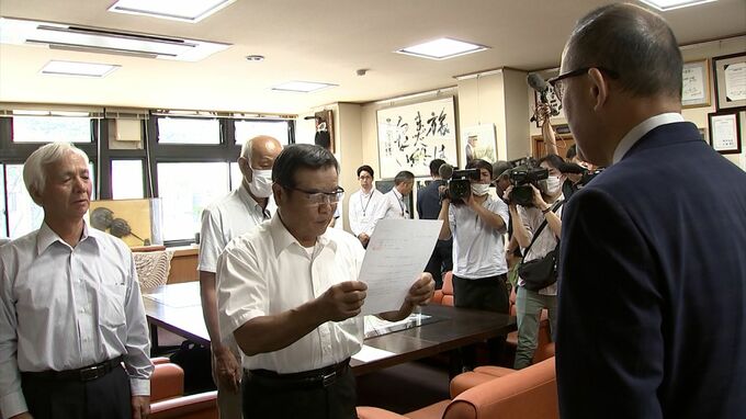 白石島の住民の代表らが笠岡市役所を訪れ、小林市長に陳情書を手渡しました。先日、笠岡伏越港と白石島を結ぶフェリーの運行を行う三洋汽船(さんようきせん)が今年いっぱいで運行を休止するとした発表を受けたものです。