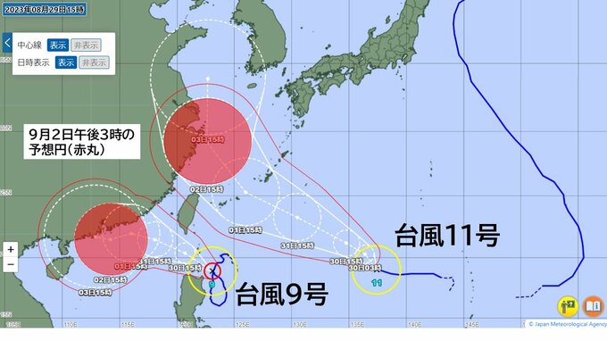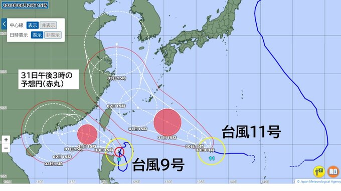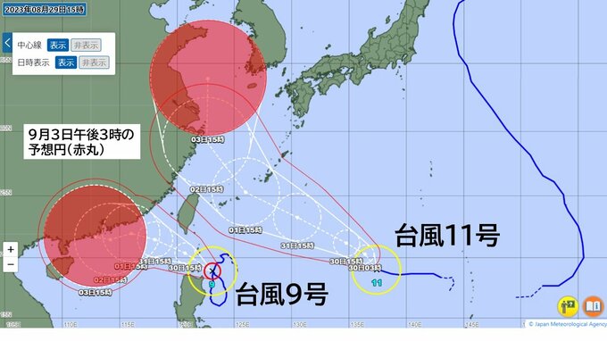 【台風情報】非常に強い台風9号は南シナ海へ 台風11号は沖縄本島近海へ接近する進路予想 2つの台風はいつ・どの程度接近するのか【位置シミュレーション】 毎日放送 2023年8月29日(火) 18:07 国内 天気 台風9号と台風11号 いつ、どこで接近するのか 日ごとの予想円を比較する (画像 気象庁HPより作成)