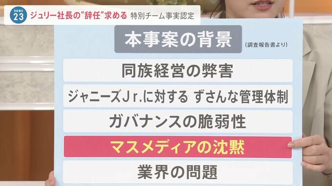 そして今回の報告書では、ジャニー氏による性加害の背景が項目として挙げられているんですけれども、その一つに「マスメディアの沈黙」という項目が立てられています。メディアから批判を受けない結果、事務所の隠ぺい体質も強化されてしまったと。
