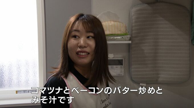 (職員)「小松菜とベーコンのバター炒めとみそ汁です。」