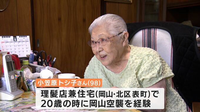 岡山市中区に住む小笠原トシ子さん98歳です。岡山空襲を経験したのは20歳のとき。実家の理髪店を手伝いながら表町で暮らしていました。
