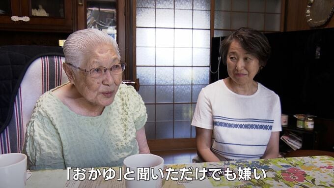 (小笠原トシ子さん(98))「あのときにしっかりと水のようなおかゆを食べたから、おかゆと聞いただけでも嫌い。嫌い」