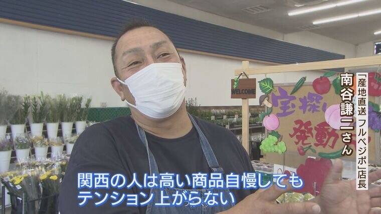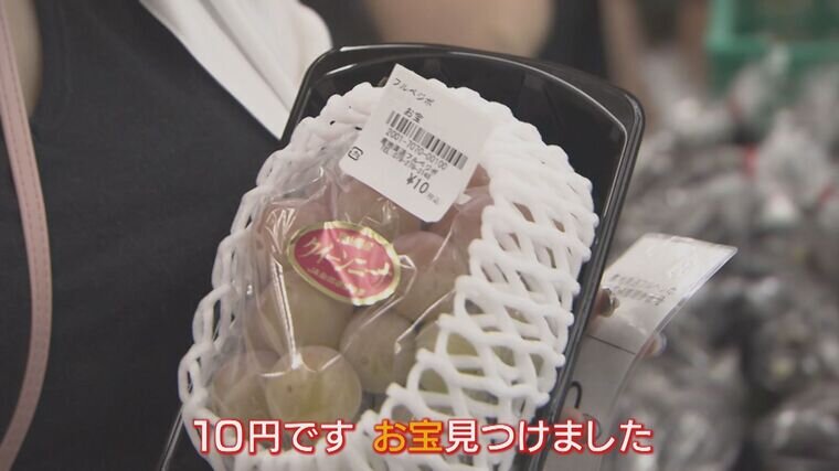 (南谷謙二店長)「店をオープンしたときに広告を出したんですけど広告代が高くて…。ちょっと違う方法ないかなと思いついたのがお宝探し。例えばシャインマスカットの10円を見つけたら間違いなく自慢しますよね。そこが一番の狙いですよね。特に関西の人は高い商品を自慢してもテンションが上がらない。だけどシャインマスカットの10円なら絶対何十人に言いたいですよね。広告代の分を全部お宝に回すように」