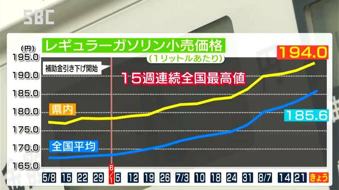 15年ぶりに過去最高値を更新した全国平均の185.6円を8.4円上回り、15週連続で全国で最も高くなっています。