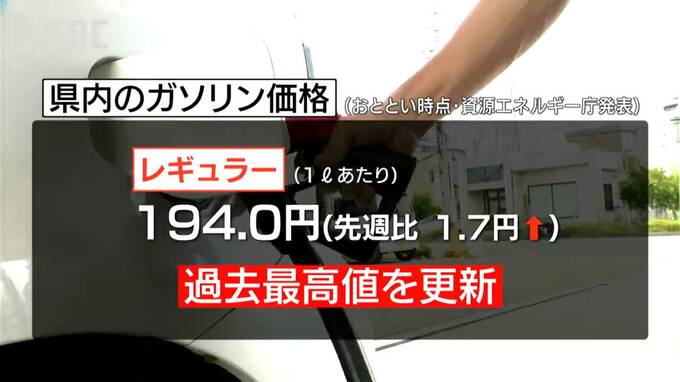 長野県内の今週のガソリン価格は、レギュラーの平均が1リットルあたり194円となり、4週連続で過去最高値を更新しました。