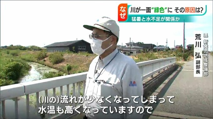 【県新発田地域整備部 荒川弘 副部長】「向こうの岸に草があると思うがその下があいていて草のギリギリくらいまでは(水が)あるような状況。流れが少なくなってしまって水温も高くなってますので、こういった水草が繁茂しやすい状況になっているのかな」