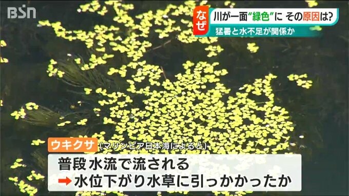 ウキクサは条件が揃うと勢いよく増え、普段は水の流れに乗って流されていくそうですが川の水位が下がったため水面から出た水草に引っかかっているのではないかということです。