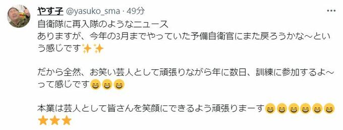 さらに「だから全然、お笑い芸人として頑張りながら年に数日、訓練に参加するよ〜って感じです」と、お笑いと訓練への向き合い方を簡潔に明かし「本業は芸人として皆さんを笑顔にできるよう頑張りまーす」と宣言しています。