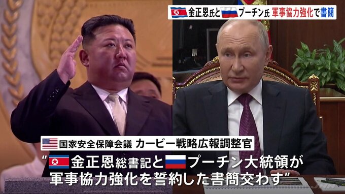 アメリカ政府の高官は、北朝鮮の金正恩総書記とロシアのプーチン大統領が2国間の軍事協力の強化に向けて書簡を交わしたことを明らかにしました。アメリカのNSC=国家安全保障会議のカービー戦略広報調整官は30日、…
