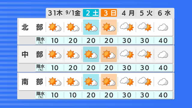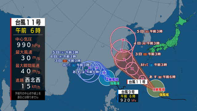 台風11号は、1日午前6時には、那覇市の南南東約320キロの北緯23度40分、東経129度10分を中心とする半径120キロの円内に達する見込みです。