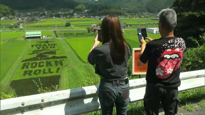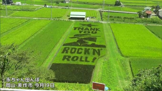 6月に植えた稲が成長し、見ごろを迎えた「永ちゃん田んぼ」です。矢沢さんがライブでよく口にするという「サンキュー」と「ロックンロール」の文字が、色の異なる稲穂ではっきりと浮かびあがりました。