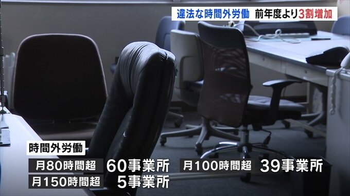 このうち「過労死ライン」とされる月80時間を超えていたのが60事業所、月100時間超えが39事業所、さらに月150時間超えも5事業所ありました。