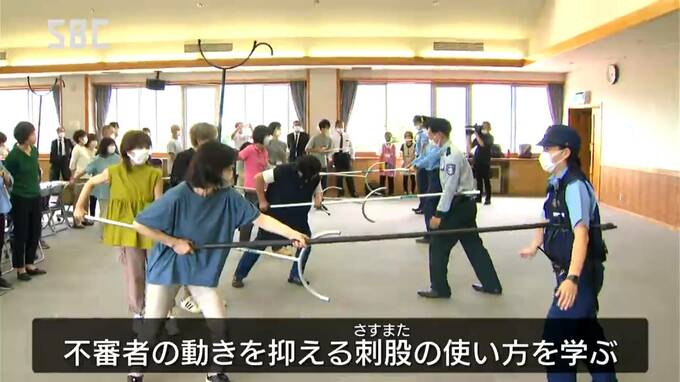 その後、参加者は、警察官の指導を受けながら、不審者の動きを抑える刺股(さすまた)の使い方を学びました。