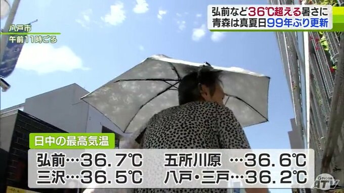 青森県内は弘前や五所川原、三沢などで36℃を超える厳しい暑さとなりました。青森では今年に入って38回目の真夏日となり、99年ぶりに観測史上最多を更新しました。厳しい暑さが続く県内。日中の最高気温は弘前で36.…