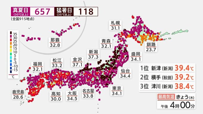 世界的に見ても異常気象が続いていますが、2023年は突出しています。特筆すべきは「暑さ」です。8月31日午後4時時点ですが、日本全国915地点中、真夏日が657地点、猛暑日が118地点です。
