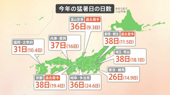 ▼群馬・桐生38日(11.5日)▼埼玉・熊谷38日(18.1日)▼東京・練馬26日(14.9日)▼富山空港36日(9.3日)▼岐阜・多治見36日(24.6日)▼京都38日(19.4日)▼兵庫・豊岡37日(16日)▼福岡・大宰府31日(10.4日)