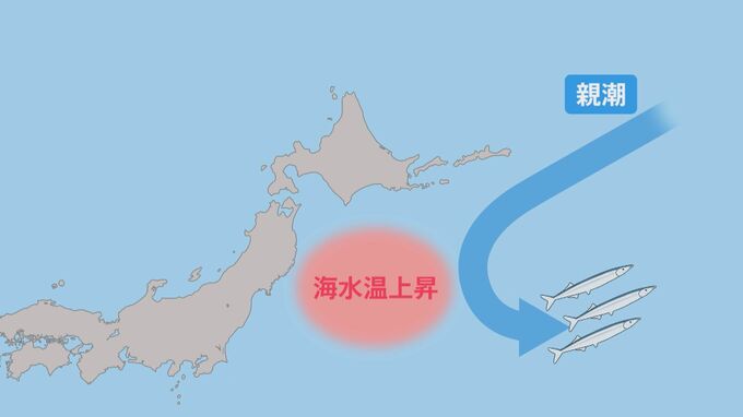 サンマは水温が低い親潮に乗って、日本の近くを南下。これまでは三陸沖まで来ていました。それが気候変動などの影響で、2010年代中盤、親潮の流れが弱くなり、日本沿岸の水温が上昇。このためサンマは、日本近海まで来なくなったとみられています。