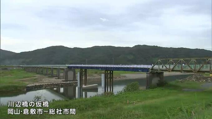大雨の影響で橋脚が傾き、通行止めになっていた岡山県の倉敷市と総社市を結ぶ「川辺橋」の仮設の橋が完成し、通行が再開されました。