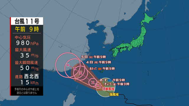 気象庁によりますと、台風11号は、1日午前9時には、沖縄の南の北緯22度30分、東経127度30分にあって、時速15キロで西北西に進んでいます。