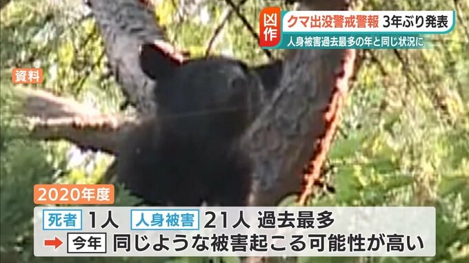また、ブナの実が豊作であった年の次の年は、出没件数が増加する傾向にあるそうですが、今年は、この条件に該当。死者1人、人身被害21人と過去最多の被害が出た2020年度のような被害が起こる可能性がかなり高いと見込んでいます。