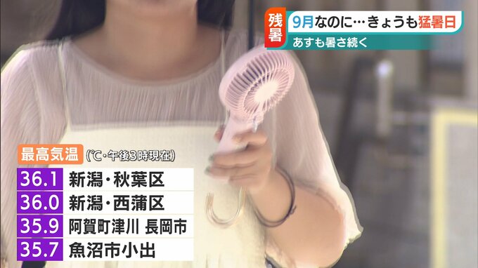 新潟県内は朝から強い日差しが照り付け、各地で気温が上がりました。日中の最高気温は新潟市秋葉区で36.1℃、新潟市西蒲区で36.0℃など各地で35℃以上の猛暑日となりました。