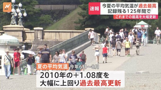 記録が残る125年間で、今年の夏の平均気温が最も高くなったことがわかりました。気象庁によりますと、日本の今年6月から8月までの夏の平均気温は、平年と比較してプラス1.76度となり、1898年に統計を始めて以降、…