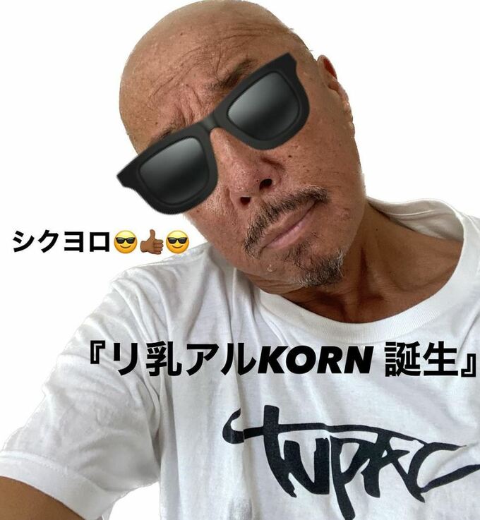 さらに次の投稿では、自身の写真に不敵に笑うサングラスの絵文字と親指サインを並べて「シクヨロ」とかぶせ、さらに『リ乳アルKORN誕生』と大書しています。
