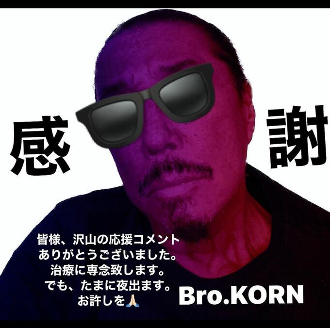 コーンさんは公表後初めての投稿で「感謝」と大書。自身の顔にはトレードマークのサングラスの代わりに絵文字のサングラスをかぶせています。そして「皆様、沢山の応援コメントありがとうございました。治療に専念致します。」と伝えつつも「でも、たまに夜出ます。お許しを」と抑えきれない「前向き」な気持ちを綴っています。