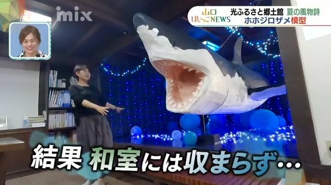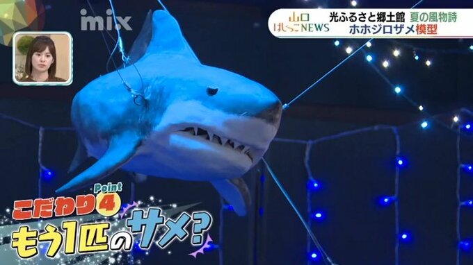 光ふるさと郷土館 夏の風物詩。ホホジロザメの模型はこれからも成長する予定です。