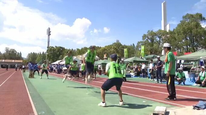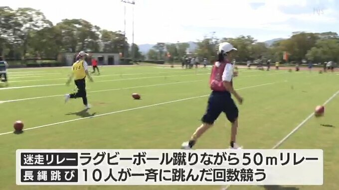 ラグビーボールを蹴りながら50メートルをリレーする「迷走リレー」や、10人が一斉に跳んだ回数を競う「長縄跳び」などが行われ、市民らが声援を受けながら汗を流していました。