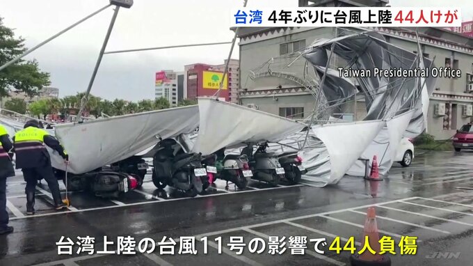 台湾メディアなどによりますと、きのうの午後、台湾に上陸した台風11号の影響であわせて44人が負傷しました。また、空の便では少なくとも246便が遅延・欠航したほか、全土で一時8万7000以上の建物が停電しました。…