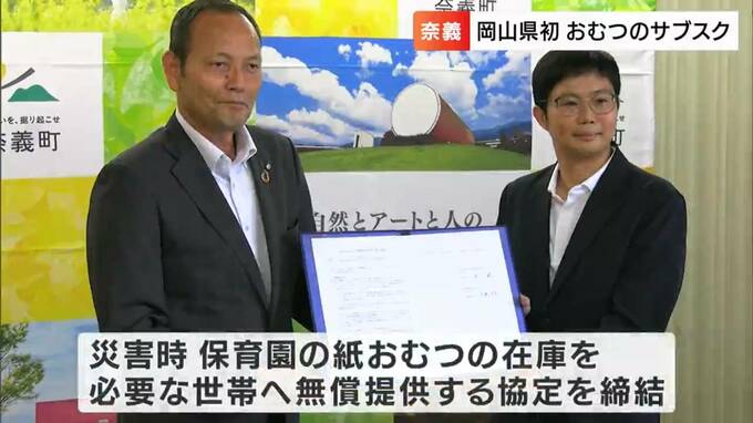 さらにサブスクの導入が決まったことで、きょう(4日)奈義町とサービスを提供する東京の会社との間で、災害支援協定も結ばれました。これにより、園にストックされた紙おむつの在庫が災害時、必要とするあらゆる世帯へ無償提供されるといいます。