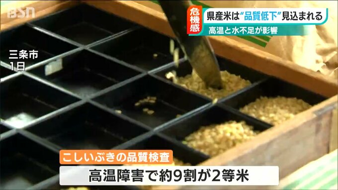 新潟県三条市では今月1日、早生米・こしいぶきの品質検査が行われ、高温障害でおよそ9割が『2等米』となりました。またコシヒカリは異常高温のため、例年より1週間ほど早く稲刈りが始まっています。コメの卸売り業者からも品質低下を懸念する声が聞かれました。