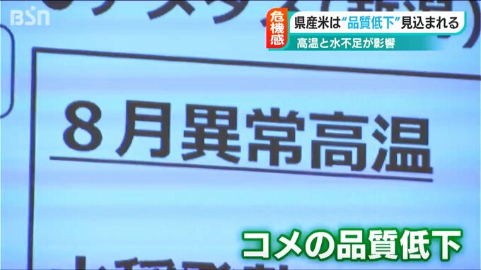 「台風による異常高温と乾燥が発生し、その後高温が続いたことから収量への影響や1等米比率の低下が避けられない」