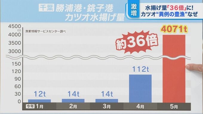 千葉の勝浦港・銚子港では、5月のカツオの水揚げ量が前月比の36倍という“異例の豊漁”になっているのです。
